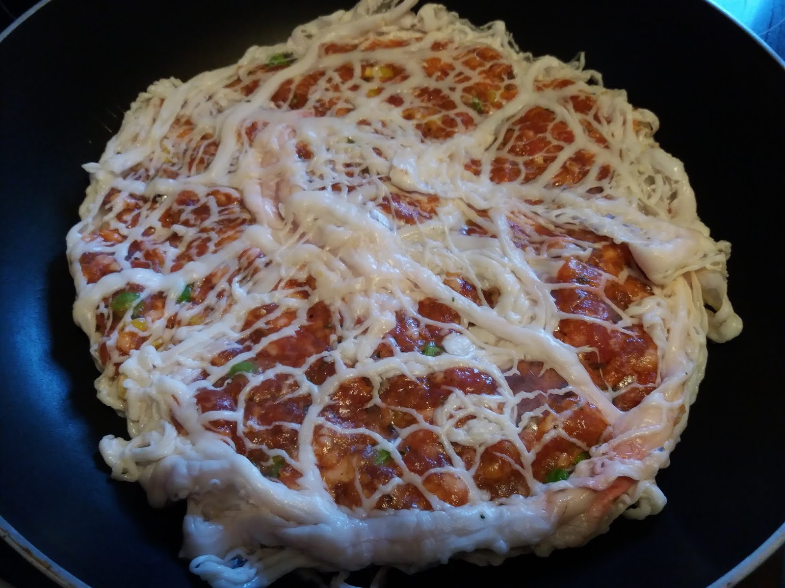 Омесената и подправена по наш вкус кайма завиваме под формата на кюфтета в було, подреждаме в тава и печем. Към същата смес добавих зеленчуци/грах, моркови и царевица/ и увих в по-голямо парче було - пекох на тиган без мазнина. При нас това се нарича "меча лапа". Вкусно!
